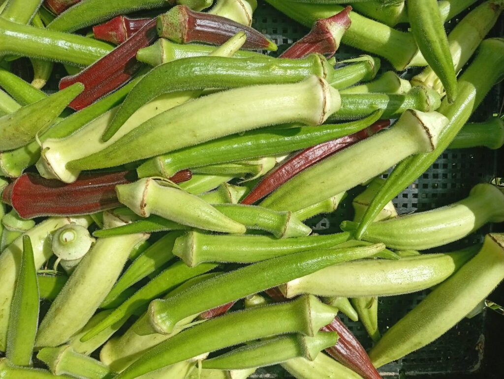 他の野菜や雑草が高温下で成長が止まる中、一際よく育つのがオクラ。9月に入って少し虫がつくようになりましたがここ数年は夏野菜でもっとも安定した収穫量を誇ります。